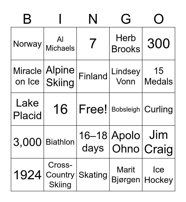 This bingo card has a free space and 29 words: 1924, France, 16, 1992, Norway, 7, Alpine Skiing, Biathlon, Bobsleigh, Cross-Country Skiing, Curling, Ice Hockey, Skating, Marit Bjørgen, 15 Medals, Curling Stones, 16–18 days, 3,000, 300, Lake Placid, Apolo Ohno, Shaun White, Lindsey Vonn, Miracle on Ice, Herb Brooks, Al Michaels, Jim Craig, Finland and Ole Einar Bjørndalen.