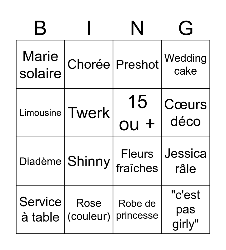 This bingo card has 16 words: Rose (couleur), Jessica râle, Preshot, Marie solaire, Diadème, Chorée, Fleurs fraîches, Robe de princesse, Limousine, Twerk, Service à table, Wedding cake, Shinny, Cœurs déco, 15 ou + and "c'est pas girly".