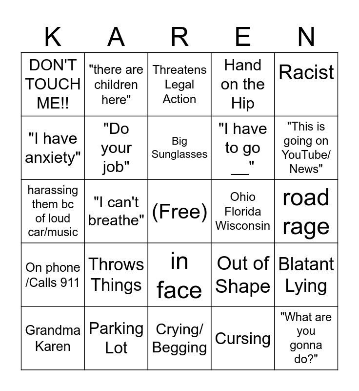 This bingo card has a free space and 104 words: Dyed / Bleached Hair, Thinking words, Racist, Entitled, I'm Sorry, Name Dropping/"Do you know who I am?", "Are you the owner/live here?", "Are you serious?", "Shut up" / "No no no", Grabs/Slaps Camera/Person, "Stop recording" / "Are you recording?", Bob Haircut, Embarrassed Husband/Boyfriend/Family Member, Walmart, Calls Police/Mentions Police/Police on Scene, Points Finger, Threatens Legal Action, "Speak with the manager/ supervisor?", "Don't touch me/my kids", Mocks Someone, Minivan, Breaks Law, Has Kids with Her, "He did it" / "Not my fault", Doesn't Accept Apology, Throws Things, "This is going on YouTube/ News", Hand on the Hip, Name Calling, "I'm recording you", Out of Shape, Cursing, "Mind your business", Gets Violent, Talks with Hands, Filmed Vertically, Repeating Themselves, Crazy Eyes, Big Sunglasses, Parking Lot, Fixes Their Hair, On phone /Calls 911, FOR WHAT??, "I have anxiety", Claps/ Clap Speaking, DON'T TOUCH ME!!, Drug possession/ use, "What are you gonna do?", "Is you a joke?", Drunk, Salary Flex, Shouting/ Screaming, "you're a joke", going off on children/teenagers, Religious, Assault, Refuse to comply, pretends to get hit or fall down, Out of shape, in face, road rage, in car/vehicle, called karen in video, hands in front of camera or face, "what's your name", "I'll sue you" / "call my lawyer", "I know my rights", "there are children here", harassing them bc of loud car/music, "I can't breathe", Crying/ Begging, "Do you know who I am?", "I know the owner", Loosen my cuffs/it hurts, Kicking/ Biting, Fake Service Dog, Angry at animals/ pets/service animal, Grandma Karen, Victim Blaming, Playing the victim, "I didn't do anything", Are you serious/ are you kidding me?, "Do your job", Weapons, Ohio Florida Wisconsin, Running / Fleeing, Nice cop, No nonsense cop, Threaten, School Board / Parent, Trespass, Resist arrest, No ID / I don't have to identify myself, Blatant Lying, Tased, "Get off of me", "I'm handicapped", "I have to go __", Taunting, Spitting / Spithood, "Stop!!", Funny Cop, "I'm a ___" and "My (family member) is a cop".