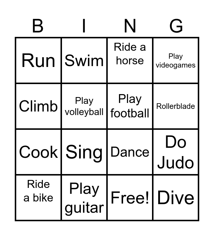 This bingo card has 17 words: Free!, Ride a bike, Ride a horse, Run, Sing, Play videogames, Do Judo, Play football, Rollerblade, Play volleyball, Play guitar, Dance, Climb, Swim, Cook, Draw and Dive.