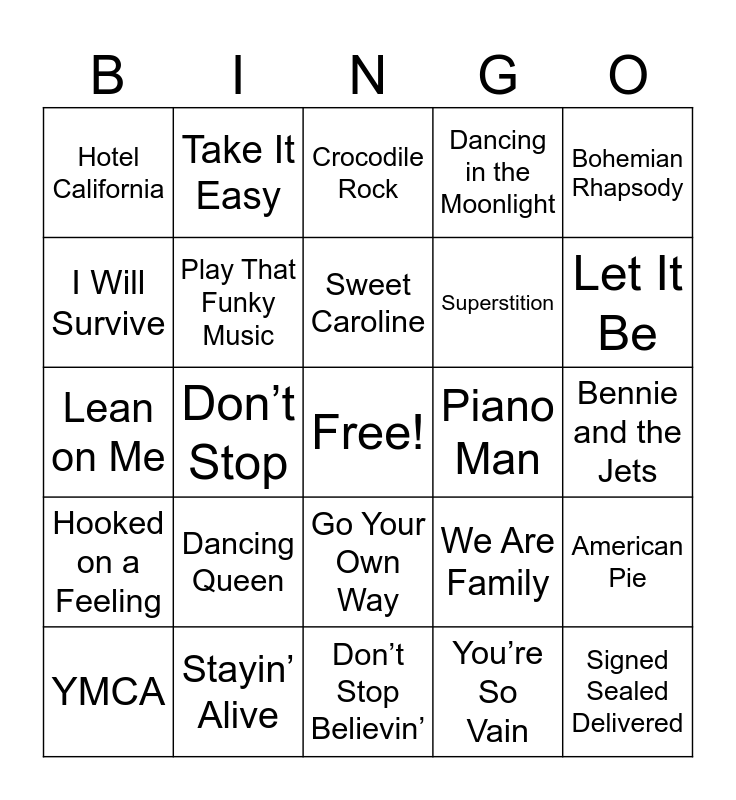 This bingo card has a free space and 24 words: Dancing Queen, Stayin’ Alive, Sweet Caroline, YMCA, Bohemian Rhapsody, Hotel California, I Will Survive, Take It Easy, Piano Man, Go Your Own Way, Superstition, Lean on Me, We Are Family, American Pie, Play That Funky Music, You’re So Vain, Bennie and the Jets, Crocodile Rock, Let It Be, Don’t Stop, Signed Sealed Delivered, Hooked on a Feeling, Dancing in the Moonlight and Don’t Stop Believin’.