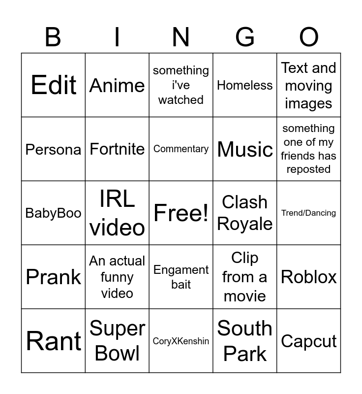 This bingo card has a free space and 24 words: An actual funny video, Super Bowl, Commentary, Rant, Text and moving images, Edit, Persona, Anime, Clash Royale, Engament bait, Music, BabyBoo, Clip from a movie, Roblox, Fortnite, South Park, Trend/Dancing, something i've watched, something one of my friends has reposted, IRL video, Capcut, Prank, Homeless and CoryXKenshin.