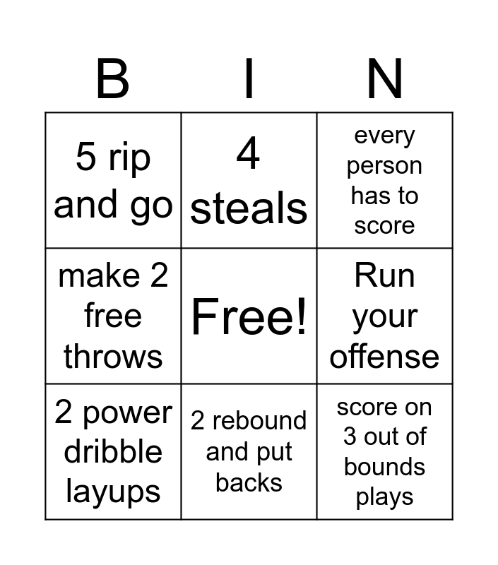 This bingo card has a free space and 8 words: Run your offense, every person has to score, 4 steals, 2 power dribble layups, 5 rip and go, score on 3 out of bounds plays, make 2 free throws and 2 rebound and put backs.