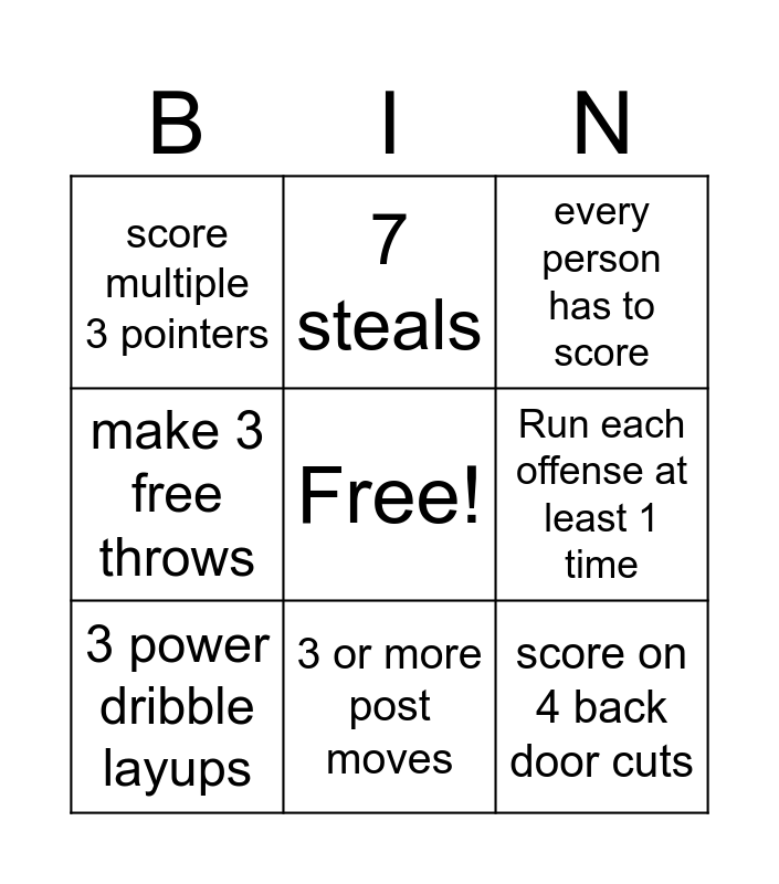 This bingo card has a free space and 8 words: Run each offense at least 1 time, every person has to score, 7 steals, 3 power dribble layups, score multiple 3 pointers, score on 4 back door cuts, make 3 free throws and 3 or more post moves.