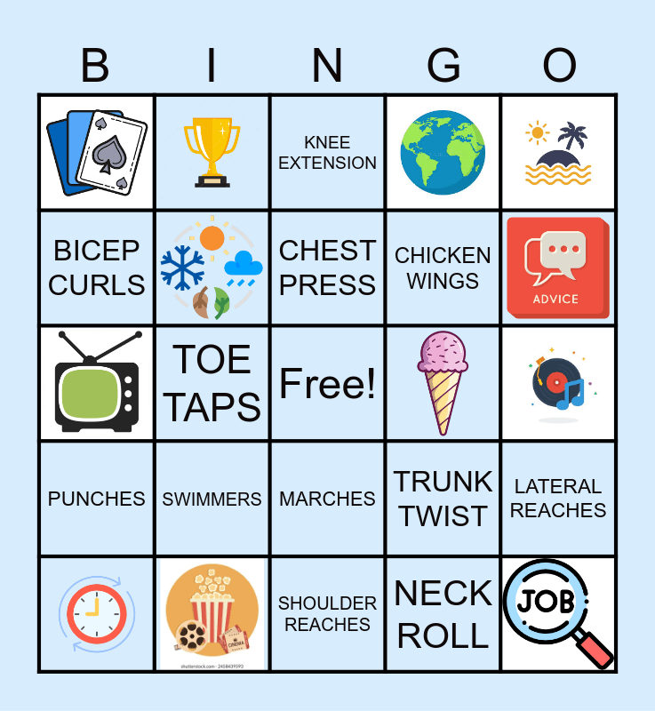 This bingo card has 12 images, a free space and 12 words: SWIMMERS, CHEST PRESS, BICEP CURLS, MARCHES, CHICKEN WINGS, TRUNK TWIST, LATERAL REACHES, NECK ROLL, KNEE EXTENSION, TOE TAPS, PUNCHES and SHOULDER REACHES.