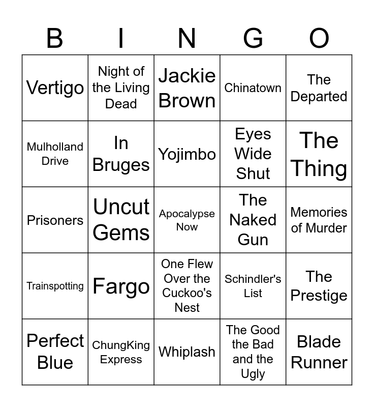 This bingo card has a free space and 24 words: Fargo, ChungKing Express, Yojimbo, Perfect Blue, The Departed, Vertigo, Mulholland Drive, Night of the Living Dead, The Naked Gun, One Flew Over the Cuckoo's Nest, Eyes Wide Shut, Prisoners, Schindler's List, The Prestige, In Bruges, The Good the Bad and the Ugly, Memories of Murder, Jackie Brown, The Thing, Uncut Gems, Blade Runner, Trainspotting, Chinatown and Whiplash.