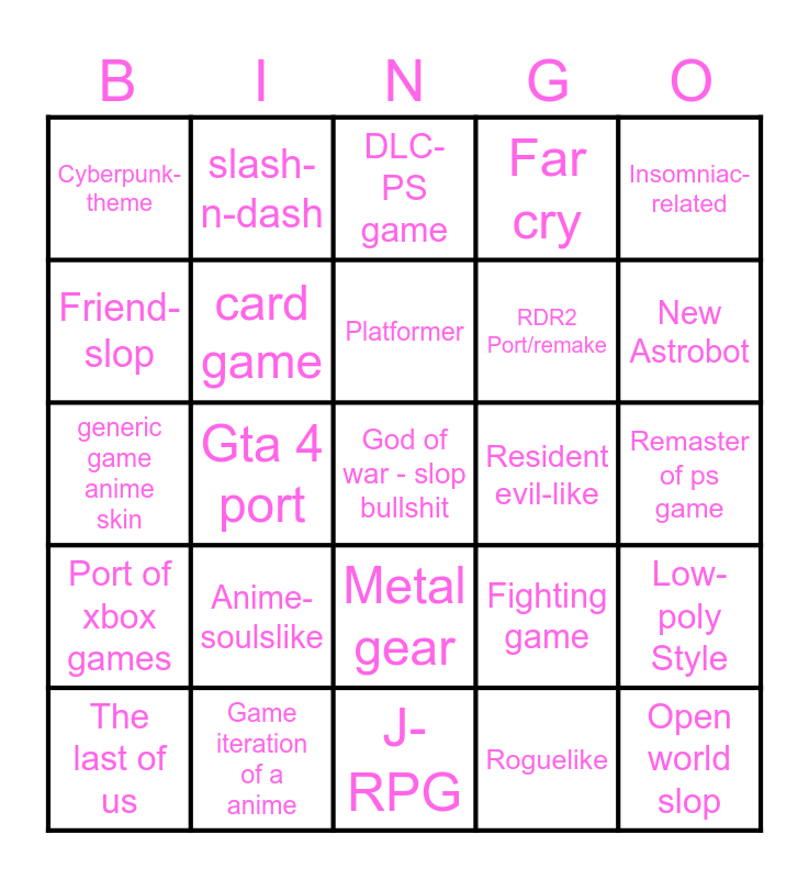 This bingo card has 25 words: Anime-soulslike, J-RPG, Platformer, The last of us, Insomniac-related, Cyberpunk-theme, Friend-slop, slash-n-dash, Resident evil-like, Metal gear, RDR2 Port/remake, generic game anime skin, Fighting game, Low-poly Style, card game, Open world slop, Remaster of ps game, DLC-PS game, New Astrobot, Gta 4 port, God of war - slop bullshit, Game iteration of a anime, Port of xbox games, Far cry and Roguelike.