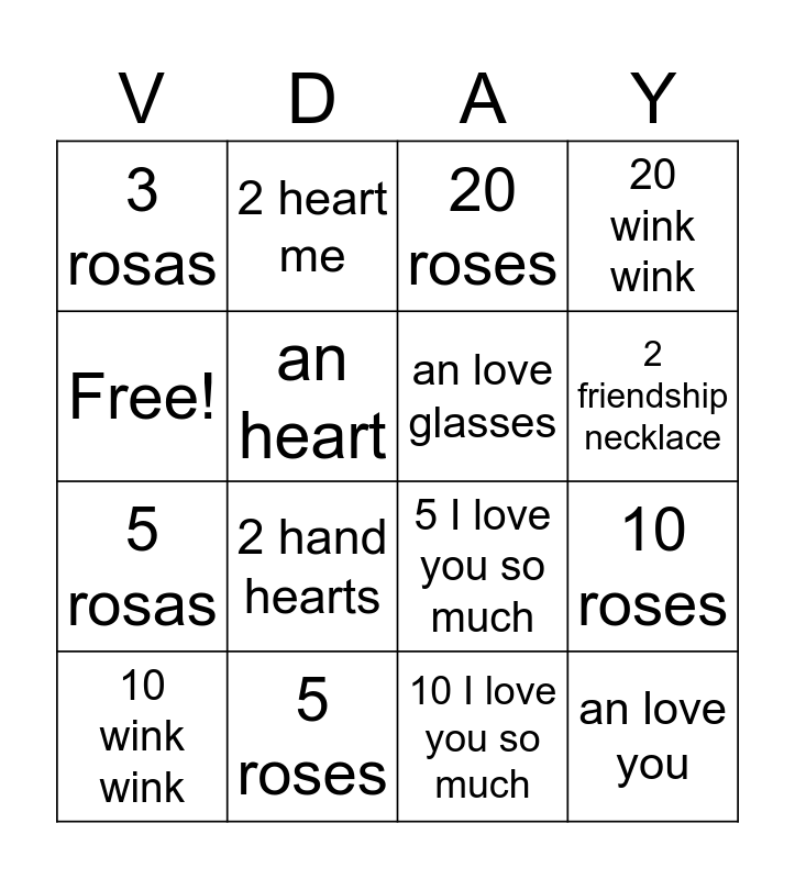 This bingo card has 16 words: 5 roses, 10 roses, 20 roses, 3 rosas, 5 rosas, 2 heart me, 5 I love you so much, 10 I love you so much, Free!, an heart, 10 wink wink, 20 wink wink, 2 hand hearts, 2 friendship necklace, an love glasses and an love you.