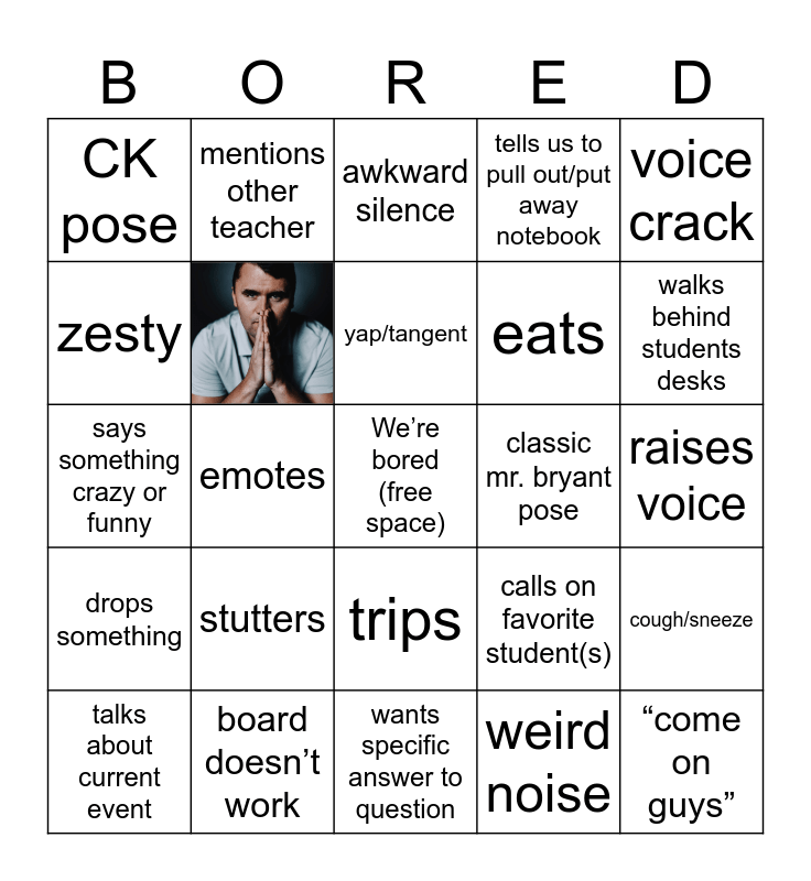 This bingo card has 2 images, a free space and 24 words: trips, weird noise, yap/tangent, board doesn’t work, voice crack, CK pose, zesty, mentions other teacher, raises voice, calls on favorite student(s), eats, says something crazy or funny, cough/sneeze, talks about current event, emotes, spin, tells us to pull out/put away notebook, drops something, awkward silence, “come on guys”, walks behind students desks, wants specific answer to question, classic mr. bryant pose and stutters.