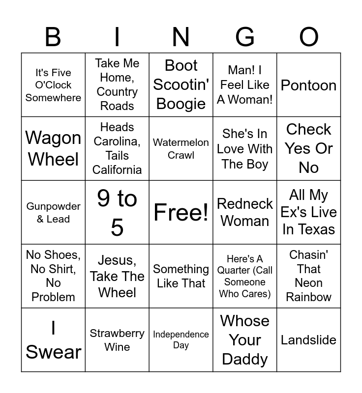 This bingo card has a free space and 70 words: Friends In Low Places, 9 to 5, Forever and Ever, Amen, On The Road Again, All My Ex's Live In Texas, The Gambler, Take Me Home, Country Roads, Islands In The Stream, She's In Love With The Boy, Stand By Your Man, Achy Breaky Heart, Chattahoochee, Boot Scootin' Boogie, Man! I Feel Like A Woman!, The Dance, No Shoes, No Shirt, No Problem, Strawberry Wine, Watermelon Crawl, This Kiss, Check Yes Or No, I Swear, Any Man Of Mine, Independence Day, Here's A Quarter (Call Someone Who Cares), Dust On The Bottle, Chicken Fried, Before He Cheats, Cruise, Redneck Woman, Live Like You Were Dying, It's Five O'Clock Somewhere, Save A Horse (Ride A Cowboy), Amazed, I Hope You Dance, Hicktown, Should've Been A Cowboy, Tequila Makes Her Clothes Fall Off, She Thinks My Tractor's Sexy, Whose Your Daddy, Pontoon, Redneck Yatch Club, Jesus, Take The Wheel, Something Like That, Beer For My Horses, The Good Stuff, Wagon Wheel, Fishin' In The Dark, Meet In The Middle, Rock My World (Little Country Girl), Brand New Man, Amarillo By Morning, Why Not Me, Guitars, Cadillacs, Highwayman, Chasin' That Neon Rainbow, If You're Gonna Play In Texas, Heads Carolina, Tails California, Prop Me Up Beside The Jukebox, My Next Thirty Years, Landslide, Gunpowder & Lead, Give It Away, Goodbye Earl, I Love This Bar, Good Directions, Leave The Pieces, Need You Know, Boondocks, Another Picture To Burn and Red High Heels.
