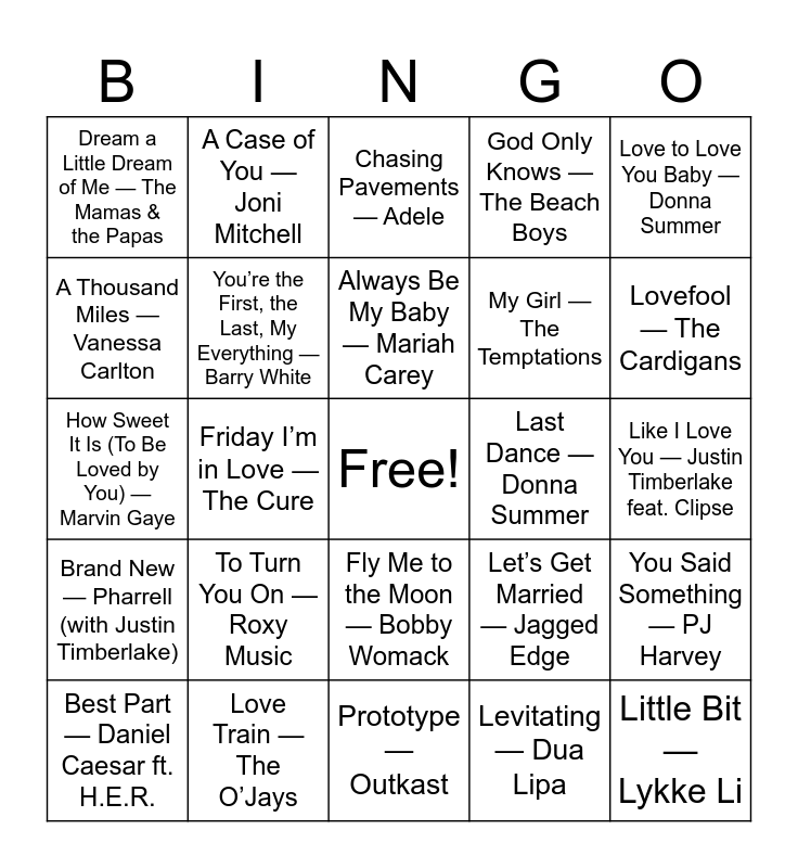 This bingo card has a free space and 75 words: I Will Always Love You — Whitney Houston, Something — The Beatles, Always Be My Baby — Mariah Carey, Nothing Even Matters — Lauryn Hill feat. D’Angelo, At Your Best (You Are Love) — Aaliyah, You Got Me — The Roots feat. Erykah Badu, Baby Love — The Supremes, Maps — Yeah Yeah Yeahs, I Wanna Be Your Lover — Prince, Sexual Healing — Marvin Gaye, My Heart Will Go On — Celine Dion, Try a Little Tenderness — Otis Redding, Fly Me to the Moon — Bobby Womack, My Girl — The Temptations, I Put a Spell on You — Nina Simone, A Thousand Miles — Vanessa Carlton, Love Train — The O’Jays, Everywhere — Michelle Branch, Ain’t No Woman Like the One I Got — The Four Tops, Lovefool — The Cardigans, First Day of My Life — Bright Eyes, A Case of You — Joni Mitchell, Prototype — Outkast, God Only Knows — The Beach Boys, Love to Love You Baby — Donna Summer, Thinkin’ Bout You — Frank Ocean, A Long Walk — Jill Scott, Your Song — Elton John, Maybe I’m Amazed — Paul McCartney, So High — John Legend, In Love With You — Erykah Badu feat. Stephen Marley, Untitled (How Does It Feel) — D’Angelo, This Old Heart of Mine (Is Weak for You) — The Isley Brothers, Let’s Get Married — Jagged Edge, Like I Love You — Justin Timberlake feat. Clipse, Dream a Little Dream of Me — The Mamas & the Papas, I’ll Make Love to You — Boyz II Men, When a Man Loves a Woman — Michael Bolton, Last Dance — Donna Summer, Little Bit — Lykke Li, Retrograde — James Blake, Such Great Heights — The Postal Service, U Got It Bad — Usher, Ribbon in the Sky — Stevie Wonder, I Say a Little Prayer — Aretha Franklin, Wild Horses — The Rolling Stones, Friday I’m in Love — The Cure, Chasing Pavements — Adele, I Got You Babe — Sonny & Cher, Ain’t No Mountain High Enough — Marvin Gaye & Tammi Terrell, 03’ Bonnie & Clyde — Beyoncé feat. Jay-Z, You’re the First, the Last, My Everything — Barry White, Always on Time — Ja Rule feat. Ashanti, Number One — Pharrell feat. Kanye West, How Deep Is Your Love — Bee Gees, A Sunday Kind of Love — Etta James, If I Ain’t Got You — Alicia Keys, At Last — Etta James, Love on Top — Beyoncé, You Make Me Feel So Young — Frank Sinatra, Best Part — Daniel Caesar ft. H.E.R., (You Make Me Feel Like) A Natural Woman — Aretha Franklin, Can’t Take My Eyes Off You — Frankie Valli & The Four Seasons, BMO — Ari Lennox, For the Love of You — The Isley Brothers, How Sweet It Is (To Be Loved by You) — Marvin Gaye, Fade Into You — Mazzy Star, Love and Happiness — Al Green, Bidi Bidi Bom Bom — Selena, You Said Something — PJ Harvey, Brand New — Pharrell (with Justin Timberlake), To Turn You On — Roxy Music, Thank You — Bonnie Raitt, Levitating — Dua Lipa and By Your Side — Sade.