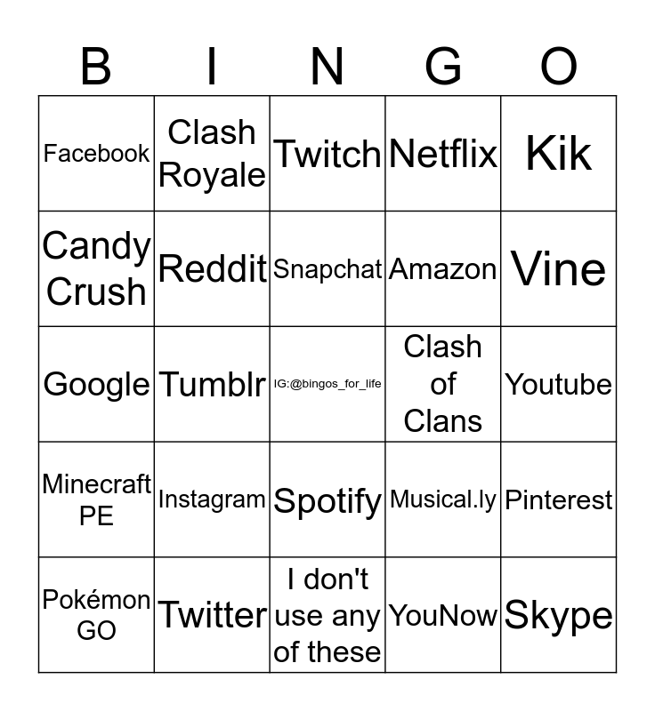 This bingo card has a free space and 24 words: Instagram, Twitter, Snapchat, Pokémon GO, Kik, Facebook, Candy Crush, Clash Royale, Clash of Clans, Spotify, Amazon, Google, Musical.ly, Pinterest, Reddit, YouNow, Youtube, Twitch, Vine, Tumblr, Skype, Minecraft PE, Netflix and I don't use any of these.