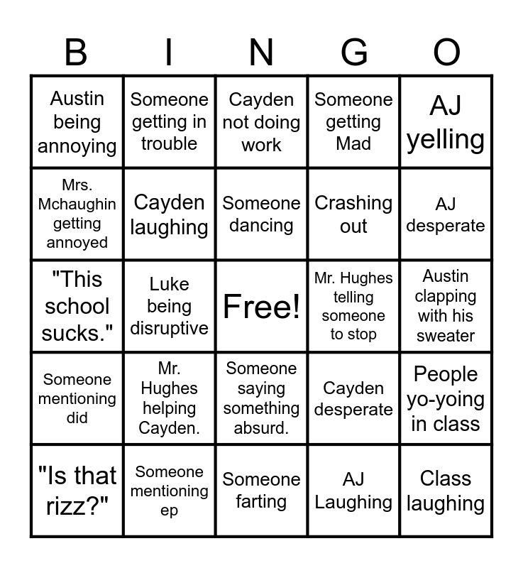 This bingo card has a free space and 25 words: Someone mentioning did, Someone mentioning ep, Someone farting, AJ Laughing, AJ yelling, Austin being annoying, Someone getting in trouble, Cayden not doing work, Mr. Hughes telling someone to stop, People yo-yoing in class, Mrs. Mchaughin getting annoyed, Cayden laughing, Free!, Cayden desperate, AJ desperate, "Is that rizz?", Luke being disruptive, Someone dancing, Crashing out, Austin clapping with his sweater, "This school sucks.", Mr. Hughes helping Cayden., Someone saying something absurd., Someone getting Mad and Class laughing.