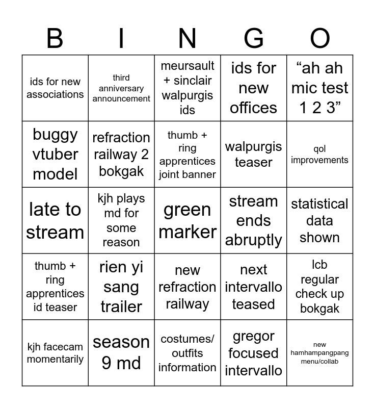 This bingo card has a free space and 24 words: rien yi sang trailer, season 9 md, thumb + ring apprentices joint banner, kjh facecam momentarily, “ah ah mic test 1 2 3”, ids for new associations, buggy vtuber model, third anniversary announcement, stream ends abruptly, new refraction railway, walpurgis teaser, late to stream, next intervallo teased, lcb regular check up bokgak, refraction railway 2 bokgak, gregor focused intervallo, statistical data shown, meursault + sinclair walpurgis ids, qol improvements, kjh plays md for some reason, new hamhampangpang menu/collab, thumb + ring apprentices id teaser, ids for new offices and costumes/ outfits information.