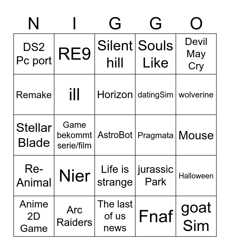 This bingo card has a free space and 24 words: Anime 2D Game, Nier, Horizon, Fnaf, Devil May Cry, DS2 Pc port, RE9, Silent hill, Pragmata, Mouse, Stellar Blade, ill, jurassic Park, Halloween, Remake, Arc Raiders, The last of us news, Souls Like, wolverine, Re-Animal, Game bekommt serie/film, Life is strange, datingSim and goat Sim.