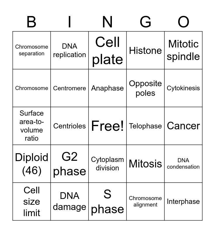 This bingo card has a free space and 50 words: Cell cycle, Interphase, G1 phase, S phase, G2 phase, M phase, DNA replication, Chromatin, Chromosome, Sister chromatids, Centromere, Histone, DNA condensation, Mitosis, Prophase, Metaphase, Anaphase, Telophase, Spindle fibers, Mitotic spindle, Centrioles, Chromosome alignment, Chromosome separation, Opposite poles, Identical daughter cells, Nuclear division, Cytokinesis, Cleavage furrow, Cell plate, Cytoplasm division, Checkpoint, G1 checkpoint, G2 checkpoint, Metaphase checkpoint, DNA damage, DNA repair, Mutation, Tumor suppressor gene, Uncontrolled cell growth, Cancer, Apoptosis, Programmed cell death, Differentiation, Specialization, Cell size limit, Surface area-to-volume ratio, Material transport, Replace damaged cells, Diploid (46) and Identical DNA.