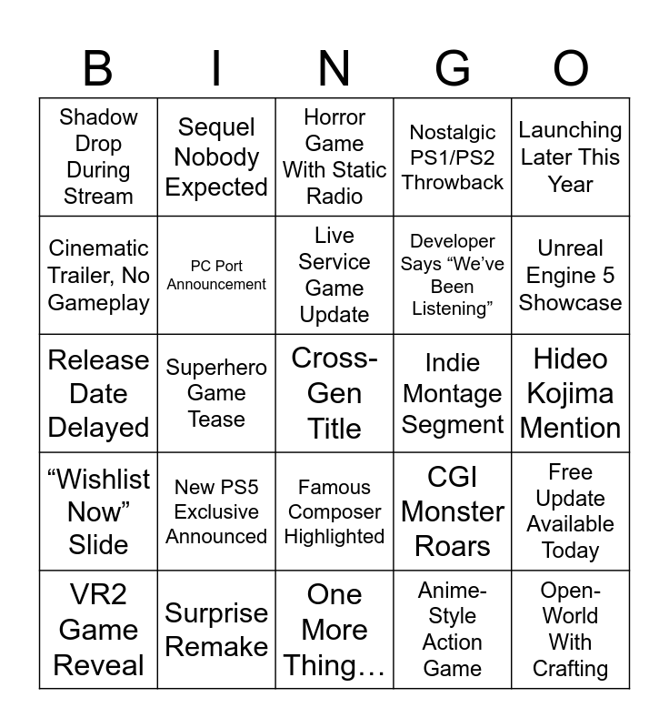 This bingo card has a free space and 24 words: New PS5 Exclusive Announced, Surprise Remake, Live Service Game Update, VR2 Game Reveal, Launching Later This Year, Shadow Drop During Stream, Cinematic Trailer, No Gameplay, Sequel Nobody Expected, Indie Montage Segment, Famous Composer Highlighted, Developer Says “We’ve Been Listening”, Release Date Delayed, CGI Monster Roars, Free Update Available Today, PC Port Announcement, Anime-Style Action Game, Hideo Kojima Mention, Horror Game With Static Radio, Unreal Engine 5 Showcase, Superhero Game Tease, Open-World With Crafting, “Wishlist Now” Slide, Nostalgic PS1/PS2 Throwback and One More Thing….