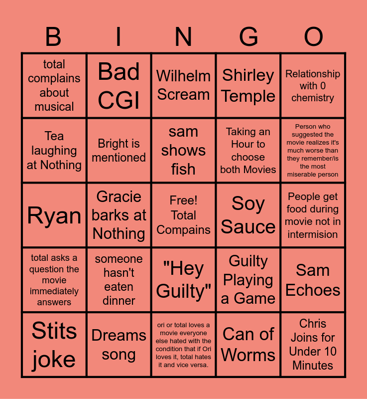 This bingo card has a free space and 24 words: someone hasn't eaten dinner, Dreams song, sam shows fish, Stits joke, Relationship with 0 chemistry, total complains about musical, Tea laughing at Nothing, Bad CGI, Soy Sauce, "Hey Guilty", Taking an Hour to choose both Movies, Ryan, Guilty Playing a Game, Sam Echoes, Bright is mentioned, Can of Worms, People get food during movie not in intermision, Wilhelm Scream, Person who suggested the movie realizes it's much worse than they remember/is the most miserable person, Gracie barks at Nothing, Chris Joins for Under 10 Minutes, total asks a question the movie immediately answers, Shirley Temple and ori or total loves a movie everyone else hated with the condition that if Ori loves it, total hates it and vice versa..