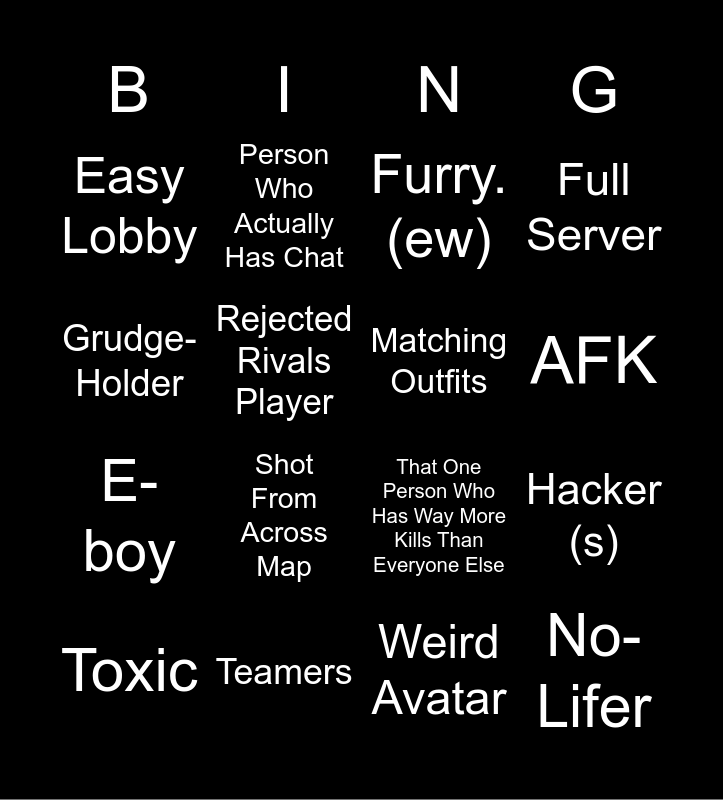 This bingo card has 20 words: Hacker (s), Bot-Filled Lobby, Furry. (ew), Spawn-Camper, Toxic, Grudge-Holder, Teamers, Easy Lobby, E-boy, Person Who Actually Has Chat, Shot From Across Map, That One Person Who Has Way More Kills Than Everyone Else, Rejected Rivals Player, No-Lifer, Matching Outfits, E-Girl, AFK, Full Server, Weird Avatar and Knife Spammer.