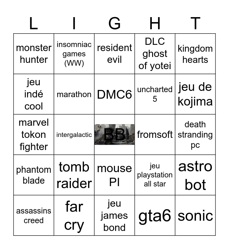 This bingo card has a free space and 24 words: tomb raider, far cry, DMC6, assassins creed, kingdom hearts, monster hunter, jeu indé cool, insomniac games (WW), fromsoft, mouse PI, uncharted 5, marvel tokon fighter, jeu playstation all star, astro bot, marathon, gta6, death stranding pc, resident evil, jeu de kojima, intergalactic, sonic, phantom blade, DLC ghost of yotei and jeu james bond.