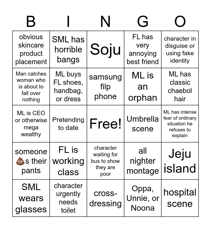 This bingo card has a free space and 24 words: FL is working class, character urgently needs toilet, samsung filp phone, SML wears glasses, character in disguise or using fake identity, obvious skincare product placement, Man catches woman who is about to fall over nothing, SML has horrible bangs, Umbrella scene, character waiting for bus to show they are poor, ML is an orphan, ML is CEO or otherwise mega wealthy, all nighter montage, Jeju island, ML buys FL shoes, handbag, or dress, Oppa, Unnie, or Noona, ML has intense fear of ordinary situation he refuses to explain, Soju, ML has classic chaebol hair, Pretending to date, hospital scene, someone 💩s their pants, FL has very annoying best friend and cross-dressing.