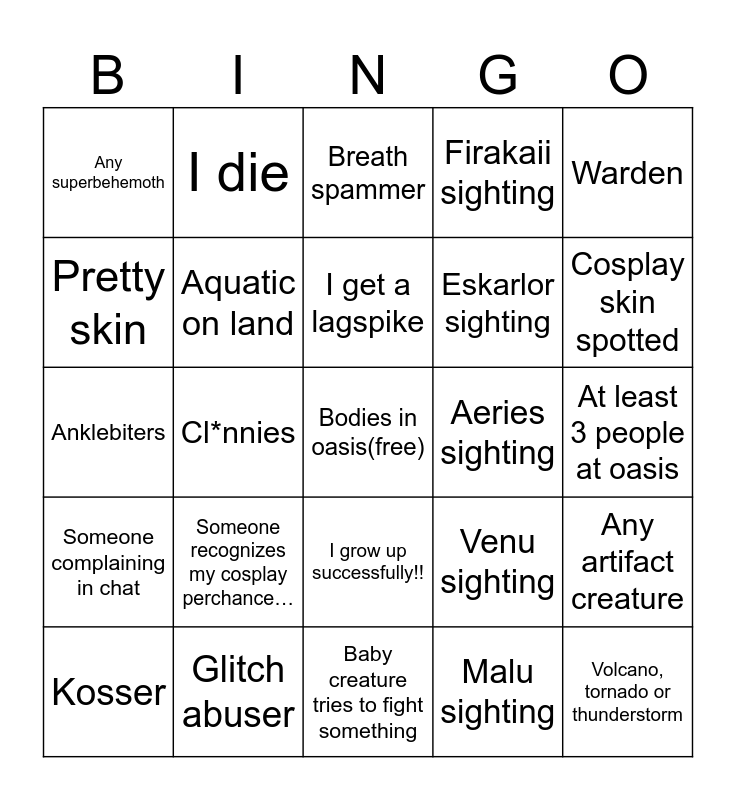 This bingo card has a free space and 24 words: Kosser, Someone recognizes my cosplay perchance…, I get a lagspike, Malu sighting, Warden, Any superbehemoth, I die, Breath spammer, Aeries sighting, At least 3 people at oasis, Anklebiters, Aquatic on land, Venu sighting, Any artifact creature, Pretty skin, Glitch abuser, Baby creature tries to fight something, Firakaii sighting, Cosplay skin spotted, Someone complaining in chat, Cl*nnies, I grow up successfully!!, Eskarlor sighting and Volcano, tornado or thunderstorm.