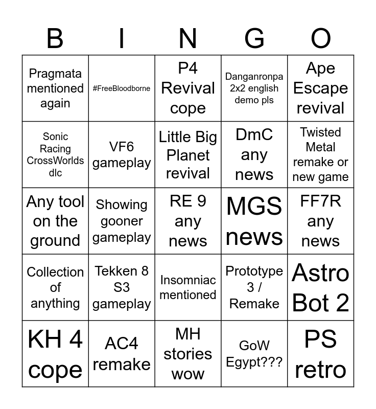 This bingo card has a free space and 24 words: Tekken 8 S3 gameplay, AC4 remake, Little Big Planet revival, KH 4 cope, Ape Escape revival, Pragmata mentioned again, Sonic Racing CrossWorlds dlc, #FreeBloodborne, MGS news, Insomniac mentioned, DmC any news, Any tool on the ground, Prototype 3 / Remake, Astro Bot 2, VF6 gameplay, GoW Egypt???, FF7R any news, P4 Revival cope, Twisted Metal remake or new game, Showing gooner gameplay, PS retro, Collection of anything, Danganronpa 2x2 english demo pls and MH stories wow.