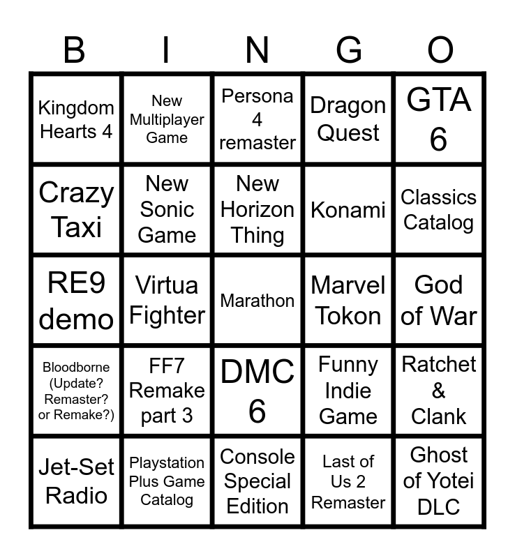This bingo card has a free space and 24 words: FF7 Remake part 3, Playstation Plus Game Catalog, New Horizon Thing, Jet-Set Radio, GTA 6, Kingdom Hearts 4, Crazy Taxi, New Multiplayer Game, Marvel Tokon, DMC 6, Konami, RE9 demo, Funny Indie Game, Ratchet & Clank, New Sonic Game, Last of Us 2 Remaster, God of War, Persona 4 remaster, Classics Catalog, Virtua Fighter, Ghost of Yotei DLC, Bloodborne (Update? Remaster? or Remake?), Dragon Quest and Console Special Edition.