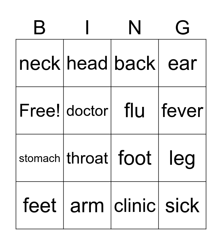 This bingo card has 16 words: arm, leg, back, neck, stomach, head, foot, clinic, Free!, doctor, feet, ear, throat, fever, flu and sick.
