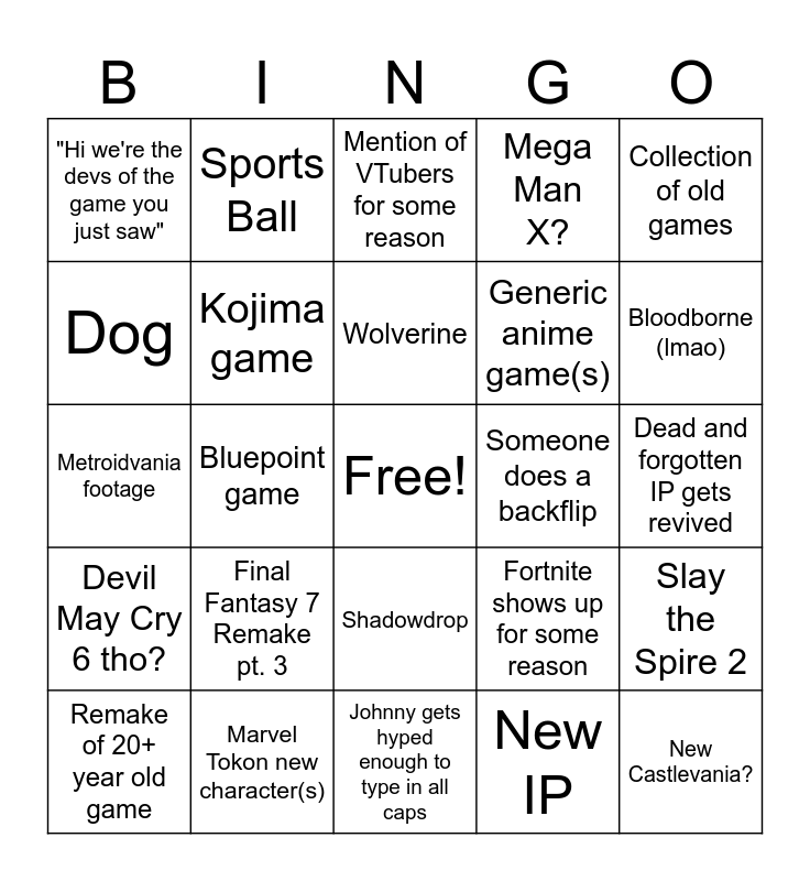 This bingo card has a free space and 24 words: Final Fantasy 7 Remake pt. 3, Marvel Tokon new character(s), Wolverine, Remake of 20+ year old game, Collection of old games, "Hi we're the devs of the game you just saw", Dog, Sports Ball, Someone does a backflip, Shadowdrop, Generic anime game(s), Metroidvania footage, Fortnite shows up for some reason, Slay the Spire 2, Kojima game, New IP, Dead and forgotten IP gets revived, Mention of VTubers for some reason, Bloodborne (lmao), Bluepoint game, New Castlevania?, Devil May Cry 6 tho?, Mega Man X? and Johnny gets hyped enough to type in all caps.