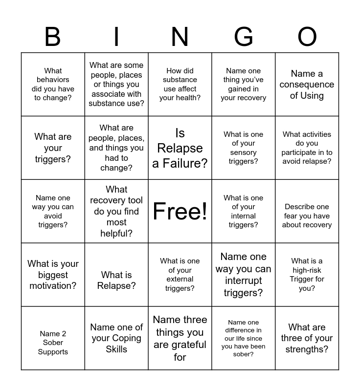 This bingo card has a free space and 24 words: What is Relapse?, Name one of your Coping Skills, Is Relapse a Failure?, Name 2 Sober Supports, Name a consequence of Using, What behaviors did you have to change?, What are your triggers?, What are some people, places or things you associate with substance use?, What is one of your internal triggers?, What is one of your external triggers?, What is one of your sensory triggers?, Name one way you can avoid triggers?, Name one way you can interrupt triggers?, What is a high-risk Trigger for you?, What are people, places, and things you had to change?, Name one difference in our life since you have been sober?, Describe one fear you have about recovery, How did substance use affect your health?, What activities do you participate in to avoid relapse?, What recovery tool do you find most helpful?, What are three of your strengths?, What is your biggest motivation?, Name one thing you’ve gained in your recovery and Name three things you are grateful for.