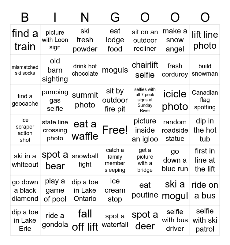 This bingo card has a free space and 48 words: eat poutine, fresh corduroy, spot a waterfall, state line crossing photo, summit photo, dip in the hot tub, picture with Loon sign, ride a gondola, make a snow angel, catch a family member sleeping, lift line photo, eat lodge food, icicle photo, selfies with all 7 peak signs at Sunday River, go down a black diamond, random roadside statue, mismatched ski socks, build snowman, ski a mogul, sit on an outdoor recliner, chairlift selfie, eat a waffle, find a train, old barn sighting, ride on a bus, drink hot chocolate, Canadian flag spotting, dip a toe in Lake Erie, sit by outdoor fire pit, pumping gas selfie, selfie with bus driver, picture inside an igloo, first in line at the lift, play a game of pool, ice scraper action shot, get a picture with a bridge, go down a blue run, find a geocache, snowball fight, dip a toe in Lake Ontario, ski in a whiteout, selfie with ski patrol, ski fresh powder, fall off lift, moguls, ice cream stop, spot a bear and spot a deer.