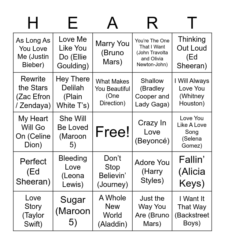 This bingo card has a free space and 34 words: Say You Won’t Let Go (James Arthur), Just the Way You Are (Bruno Mars), Can’t Help Falling In Love (Elvis Presley), All Of Me (John Legend), Perfect (Ed Sheeran), Hey There Delilah (Plain White T’s), Thinking Out Loud (Ed Sheeran), Love Story (Taylor Swift), Love Me Like You Do (Ellie Goulding), My Girl (The Temptations), What Makes You Beautiful (One Direction), Marry You (Bruno Mars), Free (Huntrix), Can You Feel The Love Tonight (Elton John), Crazy In Love (Beyoncé), I Will Always Love You (Whitney Houston), Sugar (Maroon 5), My Heart Will Go On (Celine Dion), Bleeding Love (Leona Lewis), Adore You (Harry Styles), Don’t Stop Believin’ (Journey), Isn’t She Lovely (Stevie Wonder), As Long As You Love Me (Justin Bieber), Love You Like A Love Song (Selena Gomez), A Whole New World (Aladdin), I Want It That Way (Backstreet Boys), You’re The One That I Want (John Travolta and Olivia Newton-John), Somebody To Love (Queen), Shallow (Bradley Cooper and Lady Gaga), Rewrite the Stars (Zac Efron / Zendaya), Love is an Open Door (Frozen), She Will Be Loved (Maroon 5), Fallin’ (Alicia Keys) and Somethin’ Just Like This (Coldplay).