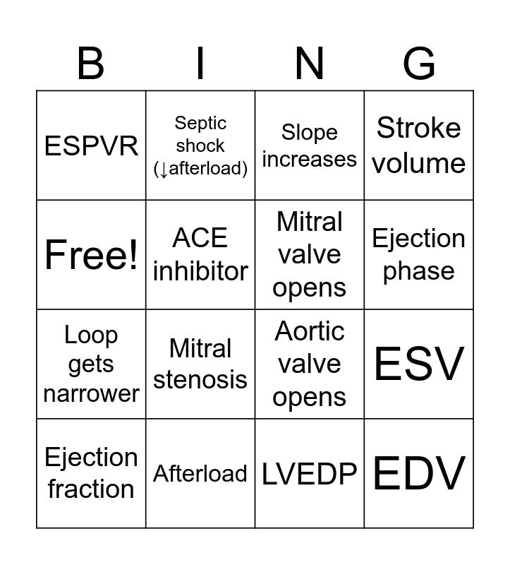 This bingo card has 41 words: Mitral valve closes, Aortic valve opens, Aortic valve closes, Mitral valve opens, Isovolumetric contraction, Isovolumetric relaxation, Ejection phase, Filling phase, Free!, EDV, ESV, Stroke volume, Ejection fraction, LVEDP, Afterload, Preload, Contractility, ESPVR, EDPVR, Slope increases, Loop shifts right, Loop shifts left, Loop gets wider, Loop gets narrower, Loop gets taller, Aortic stenosis, Aortic regurgitation, Mitral regurgitation, Mitral stenosis, Systolic HF, Diastolic HF, Septic shock (↓afterload), PE / obstructive shock, Beta blocker, Nitrates, ACE inhibitor, Dobutamine, Phenylephrine, Diuretic, Increased venous return and Increased TPR.