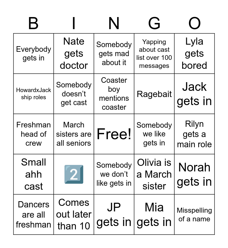 This bingo card has a free space and 30 words: Comes out later than 10, Jack gets a speaking role, March sisters are all seniors, Kylah gets in, Everybody gets in, Somebody gets mad about it, Somebody doesn’t get cast, Somebody we don’t like gets in, Somebody we like gets in, JP gets in, Rilyn gets a main role, Misspelling of a name, Mia gets in, Audenn gets in, Jack gets in, Kylie is a March sister, Olivia is a March sister, Small ahh cast, 2️⃣, Lyla gets bored, Freshman head of crew, Abby gets a big role, Nate gets doctor, Ragebait, HowardxJack ship roles, Yapping about cast list over 100 messages, Norah gets in, Dancers are all freshman, Coaster boy mentions coaster and Andrew in drag.