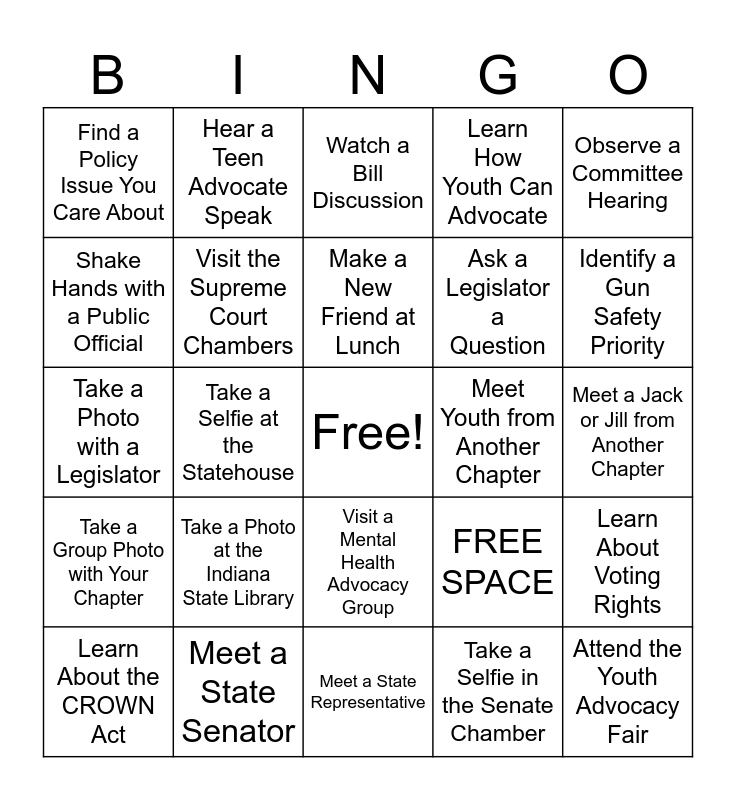This bingo card has a free space and 25 words: Take a Photo at the Indiana State Library, Meet a State Representative, Make a New Friend at Lunch, Learn About the CROWN Act, Observe a Committee Hearing, Find a Policy Issue You Care About, Shake Hands with a Public Official, Hear a Teen Advocate Speak, Meet Youth from Another Chapter, Visit a Mental Health Advocacy Group, Ask a Legislator a Question, Take a Photo with a Legislator, FREE SPACE, Learn About Voting Rights, Visit the Supreme Court Chambers, Introduce Yourself to a New Jack or Jill Family, Meet a Jack or Jill from Another Chapter, Watch a Bill Discussion, Identify a Gun Safety Priority, Take a Selfie at the Statehouse, Attend the Youth Advocacy Fair, Meet a State Senator, Take a Group Photo with Your Chapter, Learn How Youth Can Advocate and Take a Selfie in the Senate Chamber.