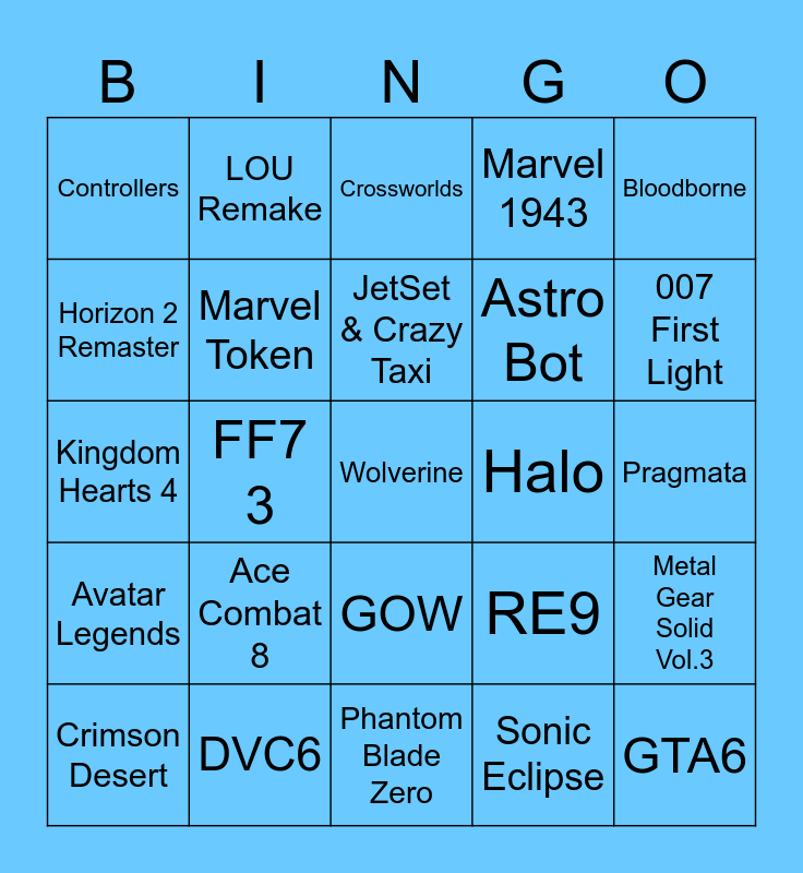 This bingo card has a free space and 24 words: Ace Combat 8, DVC6, JetSet & Crazy Taxi, Crimson Desert, Bloodborne, Controllers, Horizon 2 Remaster, LOU Remake, Halo, GOW, Astro Bot, Kingdom Hearts 4, RE9, Metal Gear Solid Vol.3, Marvel Token, Sonic Eclipse, Pragmata, Crossworlds, 007 First Light, FF7 3, GTA6, Avatar Legends, Marvel 1943 and Phantom Blade Zero.