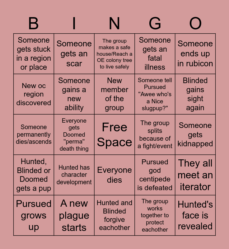 This bingo card has a free space and 24 words: Hunted has character development, A new plague starts, New member of the group, Pursued grows up, Someone ends up in rubicon, Someone gets stuck in a region or place, New oc region discovered, Someone gets an scar, The group splits because of a fight/event, Everyone dies, Someone tell Pursued ''Awee who's a Nice slugpup?'', Someone permanently dies/ascends, Pursued god centipede is defeated, They all meet an iterator, Someone gains a new ability, The group works together to protect eachother, Someone gets kidnapped, The group makes a safe house/Reach a OE colony tree to live safely, Blinded gains sight again, Everyone gets Doomed ''perma'' death thing, Hunted's face is revealed, Hunted, Blinded or Doomed gets a pup, Someone gets an fatal illness and Hunted and Blinded forgive eachother.