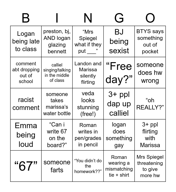 This bingo card has a free space and 24 words: “Can i write 67 on the board?”, someone farts, Landon and Marissa silently flirting, “67”, BTYS says something out of pocket, Logan being late to class, comment abt dropping out of school, preston, bj, AND logan glazing bennett, 3+ ppl dap up calliel, Roman writes in pen/grades in pencil, “Free day?”, racist comment, logan does something gay, 3+ ppl flirting with Marissa, calliel singing/talking in the middle of class, Roman wearing a mismatching tie + shirt, “oh REALLY?”, “Mrs Spiegel what if they put ___”, someone does hw wrong, someone takes marissa’s water bottle, Mrs Spiegel threatening to give more hw, Emma being loud, BJ being sexist and “You didn’t do the homework??”.