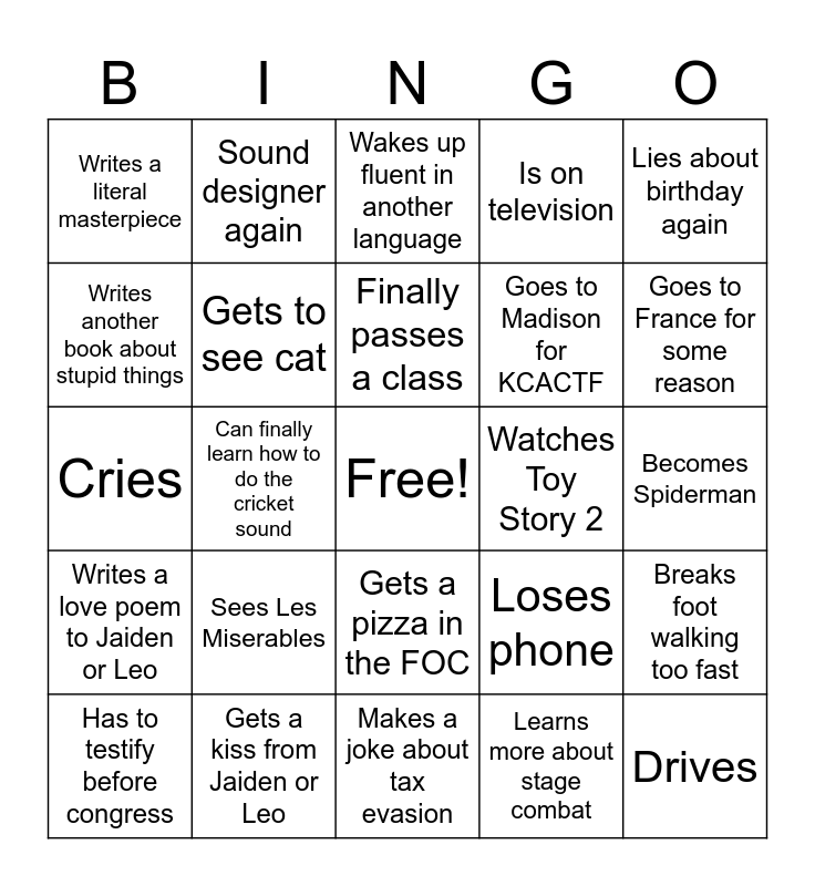 This bingo card has a free space and 24 words: Sees Les Miserables, Gets a kiss from Jaiden or Leo, Finally passes a class, Has to testify before congress, Lies about birthday again, Writes a literal masterpiece, Writes another book about stupid things, Sound designer again, Watches Toy Story 2, Gets a pizza in the FOC, Goes to Madison for KCACTF, Cries, Loses phone, Breaks foot walking too fast, Gets to see cat, Learns more about stage combat, Becomes Spiderman, Wakes up fluent in another language, Goes to France for some reason, Can finally learn how to do the cricket sound, Drives, Writes a love poem to Jaiden or Leo, Is on television and Makes a joke about tax evasion.