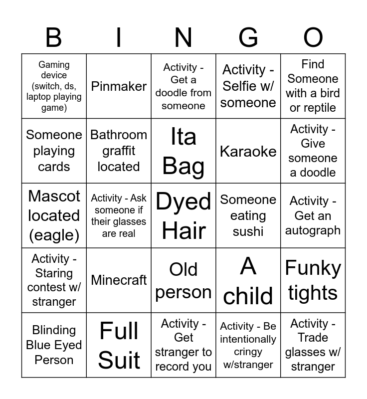 This bingo card has a free space and 24 words: Minecraft, Full Suit, Ita Bag, Blinding Blue Eyed Person, Find Someone with a bird or reptile, Gaming device (switch, ds, laptop playing game), Someone playing cards, Pinmaker, Someone eating sushi, Old person, Karaoke, Mascot located (eagle), A child, Funky tights, Bathroom graffit located, Activity - Be intentionally cringy w/stranger, Activity - Get an autograph, Activity - Get a doodle from someone, Activity - Give someone a doodle, Activity - Ask someone if their glasses are real, Activity - Trade glasses w/ stranger, Activity - Staring contest w/ stranger, Activity - Selfie w/ someone and Activity - Get stranger to record you.