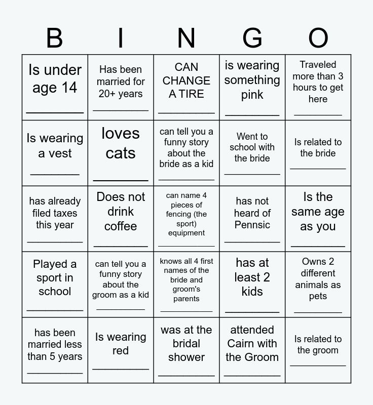 This bingo card has 35 words: PLAYS A MUSICAL INSTRUMENT ____________, knows the groom's middle name __________, Knows the bride's middle name ___________, Went to school with the bride ___________, Is related to the groom ___________, Is under age 14 _______, loves cats ______, NON-FAMILY MEMBER WHO KNOWS BRIDE/GROOM ______________, has not heard of Pennsic __________, Is wearing black shoes _________, has already filed taxes this year __________, Has been married for 20+ years __________, knows all 4 first names of the bride and groom's parents ____________, has attended this church _________, Traveled more than 3 hours to get here _________, Played a sport in school _________, Is wearing red _________, CAN CHANGE A TIRE _________, attended Cairn with the Groom _________, Is the same age as you ________, has been married less than 5 years __________, Does not drink coffee ________, can name 4 pieces of fencing (the sport) equipment _____________, Is left handed ______, Is related to the bride ___________, Is wearing a vest _______, enjoys eating venison _________, was at the bridal shower _________, has at least 2 kids ________, Owns 2 different animals as pets _________, Can converse in another language __________, can tell you a funny story about the groom as a kid __________, can tell you a funny story about the bride as a kid ___________, is wearing something pink ________ and can name at least 5 people in the wedding party __________.