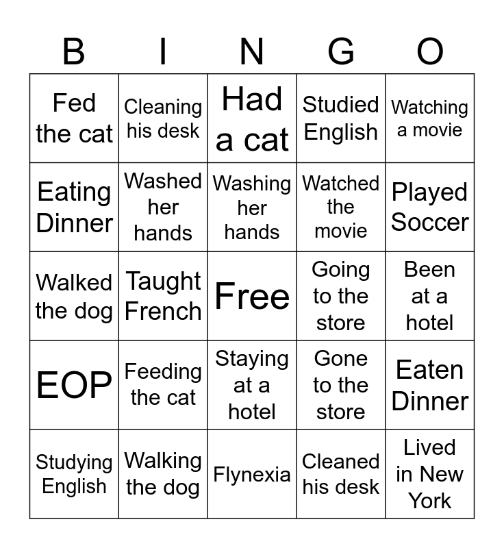 This bingo card has a free space and 24 words: Feeding the cat, Walking the dog, Washing her hands, Studying English, Watching a movie, Fed the cat, Eating Dinner, Cleaning his desk, Going to the store, Staying at a hotel, Watched the movie, Walked the dog, Gone to the store, Eaten Dinner, Washed her hands, Cleaned his desk, Been at a hotel, Had a cat, Played Soccer, Taught French, Lived in New York, EOP, Studied English and Flynexia.