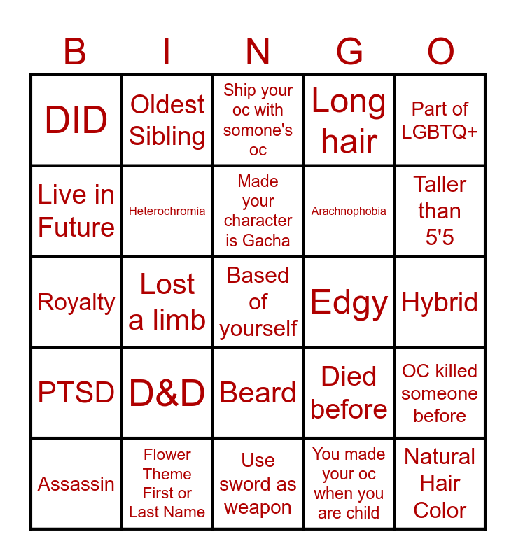 This bingo card has a free space and 24 words: Assassin, D&D, Made your character is Gacha, You made your oc when you are child, Part of LGBTQ+, DID, Oldest Sibling, Ship your oc with somone's oc, Edgy, Hybrid, Royalty, Heterochromia, Died before, OC killed someone before, Live in Future, Flower Theme First or Last Name, Use sword as weapon, Long hair, Taller than 5'5, PTSD, Lost a limb, Beard, Arachnophobia and Natural Hair Color.