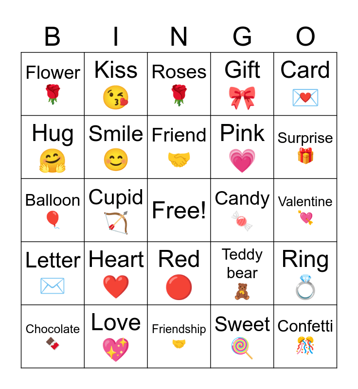 This bingo card has a free space and 24 words: Heart β€οΈ, Love π, Friend π€, Chocolate π«, Card π, Flower πΉ, Hug π€, Kiss π, Candy π¬, Red π΄, Pink π, Balloon π, Teddy bear π§Έ, Ring π, Smile π, Sweet π, Valentine π, Roses πΉ, Surprise π, Cupid πΉ, Confetti π, Letter βοΈ, Gift π and Friendship π€.