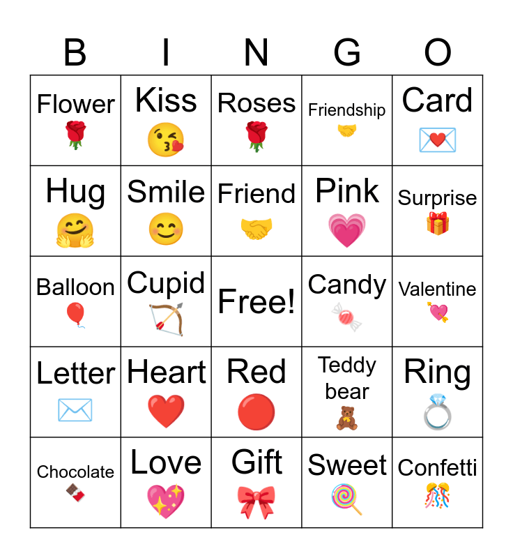 This bingo card has a free space and 24 words: Heart β€οΈ, Love π, Friend π€, Chocolate π«, Card π, Flower πΉ, Hug π€, Kiss π, Candy π¬, Red π΄, Pink π, Balloon π, Teddy bear π§Έ, Ring π, Smile π, Sweet π, Valentine π, Roses πΉ, Surprise π, Cupid πΉ, Confetti π, Letter βοΈ, Friendship π€ and Gift π.