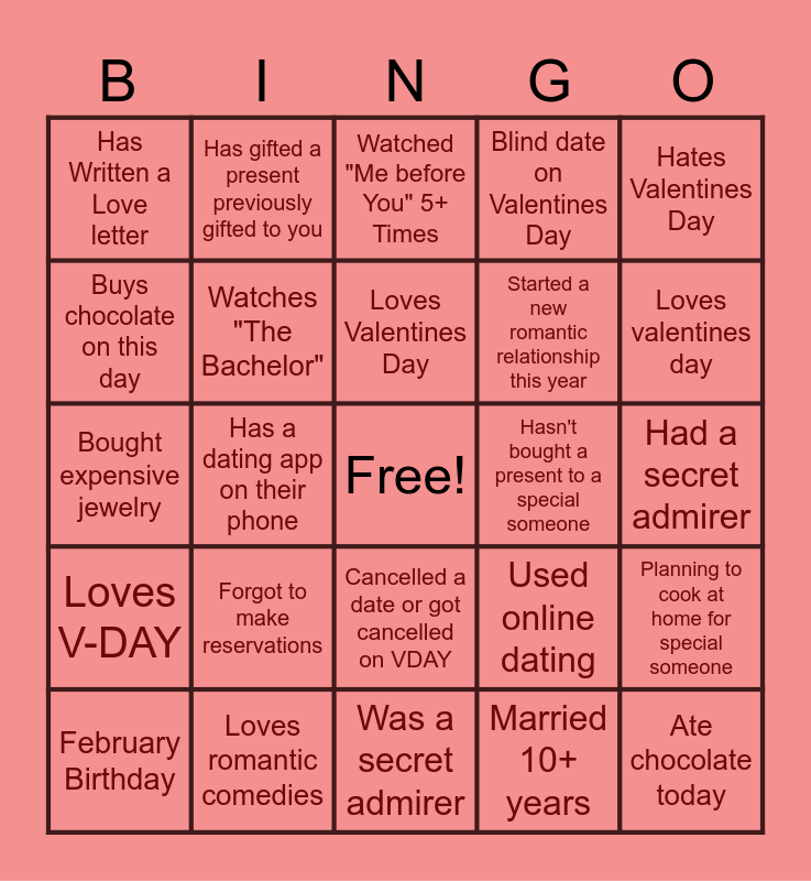 This bingo card has a free space and 24 words: February Birthday, Forgot to make reservations, Loves Valentines Day, Married 10+ years, Hates Valentines Day, Has Written a Love letter, Has gifted a present previously gifted to you, Watched "Me before You" 5+ Times, Hasn't bought a present to a special someone, Had a secret admirer, Bought expensive jewelry, Watches "The Bachelor", Used online dating, Planning to cook at home for special someone, Buys chocolate on this day, Loves romantic comedies, Was a secret admirer, Blind date on Valentines Day, Loves valentines day, Loves V-DAY, Has a dating app on their phone, Cancelled a date or got cancelled on VDAY, Started a new romantic relationship this year and Ate chocolate today.