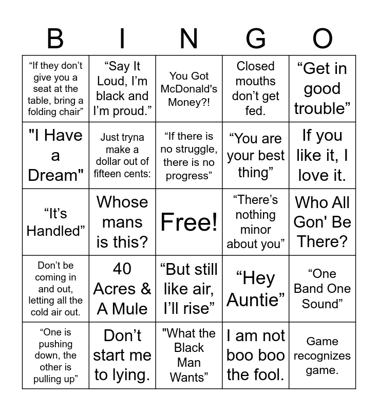 This bingo card has a free space and 25 words: 40 Acres & A Mule, "What the Black Man Wants”, “If there is no struggle, there is no progress”, “One is pushing down, the other is pulling up”, “Get in good trouble”, “If they don’t give you a seat at the table, bring a folding chair”, "I Have a Dream", “Say It Loud, I’m black and I’m proud.”, “There’s nothing minor about you”, “But still like air, I’ll rise”, “You are your best thing”, “It’s Handled”, “Hey Auntie”, “One Band One Sound”, Just tryna make a dollar out of fifteen cents:, I Ain't One of Your Lil' Friends, Who All Gon' Be There?, You Got McDonald's Money?!, If you like it, I love it., Whose mans is this?, Game recognizes game., Don’t start me to lying., Don’t be coming in and out, letting all the cold air out., Closed mouths don’t get fed. and I am not boo boo the fool..