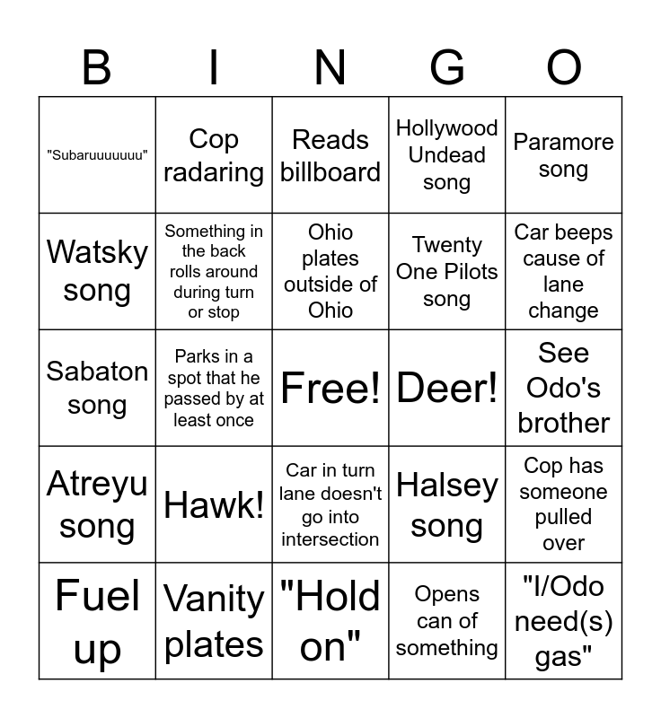 This bingo card has a free space and 29 words: Fuel up, Exasperated "Idiot" or "what are you doing" or "really?", Parks in a spot that he passed by at least once, Odo's name mentioned, "Subaruuuuuuu", Reads billboard, Something in the back rolls around during turn or stop, Hawk!, Deer!, Vanity plates, See Odo's brother, "I/Odo need(s) gas", "Hold on", Opens can of something, Car beeps cause of lane change, Car beeps cause of car ahead, Car in turn lane doesn't go into intersection, Atreyu song, Paramore song, Sabaton song, Halsey song, Fall Out Boy song, Twenty One Pilots song, Watsky song, Hollywood Undead song, Cop radaring, Cop has someone pulled over, Ohio plates outside of Ohio and Florida plates outside of Florida.