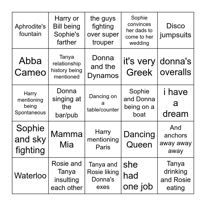 This bingo card has a free space and 24 words: Mamma Mia, Rosie and Tanya insulting each other, Donna and the Dynamos, Waterloo, Disco jumpsuits, Aphrodite's fountain, Abba Cameo, Harry or Bill being Sophie's farther, Sophie and Donna being on a boat, Harry mentioning Paris, it's very Greek, Harry mentioning being Spontaneous, Dancing Queen, And anchors away away away, Tanya relationship history being mentioned, she had one job, i have a dream, the guys fighting over super trouper, donna's overalls, Donna singing at the bar/pub, Tanya drinking and Rosie eating, Sophie and sky fighting, Sophie convinces her dads to come to her wedding and Tanya and Rosie liking Donna's exes.